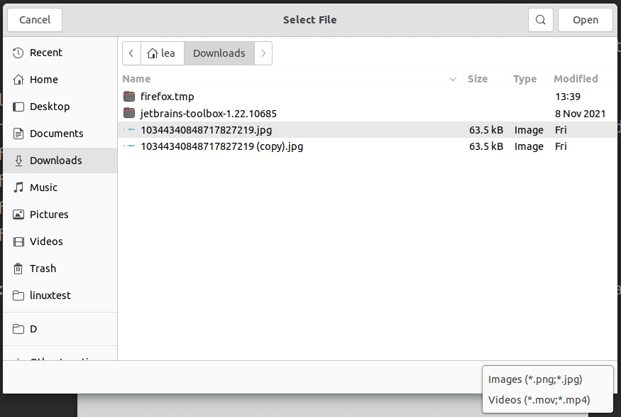 Cela se traduira par l'ouverture de la boîte de dialogue "Ouvrir un fichier" en utilisant *.png,*.jpg,*.mov,*.mp4 comme filtres.